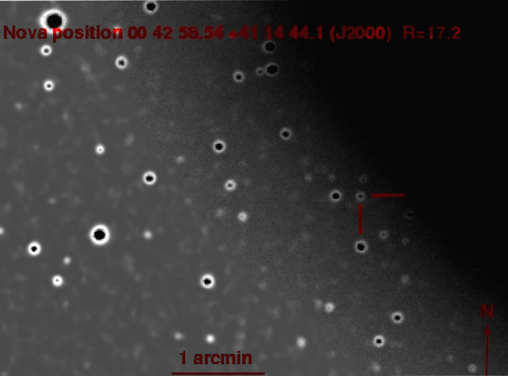 Found in M31 at R.A. = 00h42m14s.760, Decl. = +41°17'28".40 Located 333".3 west and 79".9 north of the center of M31 (Discovery image) (Marc Serrau image) (Klaus Wenzel image) Mag 16.7:12/17 (16.6:12/13), Type EGN (References: ATEL 17542, ATEL 17550, CBAT TOCP) |