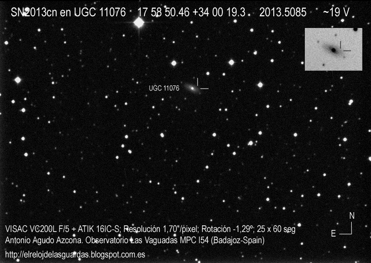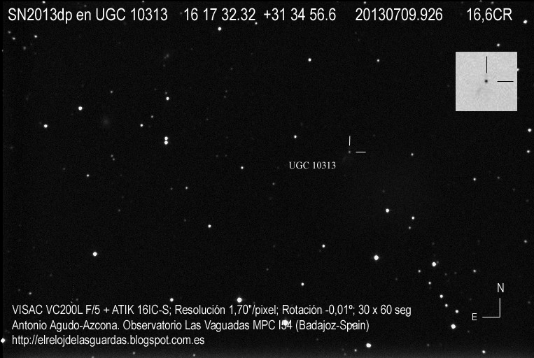 Tim Puckett Found in UGC 1825 at R.A. = 02h22m04s.26, Decl. = +32°13'57".8 Located 5".7 east and 7".7 south of the center of UGC 1825 (Discovery image) Mag 17.3:2/2 (16.4:1/3), Type Ia (z=0.033807) (References: vsnet-recent-sn 4092 CBAT TOCP, TNS) 2013A images sub-page |