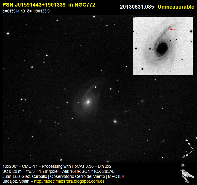 Masaki Tsuboi Found in PGC 33561 at R.A. = 11h05m55s.22, Decl. = +72°31'20".3 Located 5" west and 11" south of the center of PGC 33561 (Discovery image) (T. Yusa image) (Giancarlo Cortini image) (N. Noguchi image) (K. Kadota image) (Andre Mantero image) (Joseph Brimacombe image) (Tochigi image prediscovery) (William Wiethoff image) (JM Llapasset image) (Manuel Diaz image) (JM Llapasset image) (Massimiliano Martignoni image) (Thomas Langhans image) (Manfred Mrotzek image) Mag 18.0:4/17 (16.1:1/13), Type Ia (z=0.023957) (References: CBAT TOCP, TNS) |