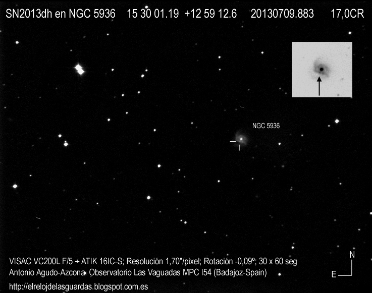and Stan Howerton Found in MCG +5-22-20 at R.A. = 09h13m37s.17, Decl. = +29°59'58".7 Located 2".3 west and 0".3 north of the center of MCG +5-22-20 (Discovery image) Mag 16.3:4/23 (15.3:2/1), Type Ia (was Ic) (z=0.024537) (Asiago spectrum) (References: CBAT TOCP, ATEL 4772, CBET 3409, vsnet-recent-sn 4176, TNS) 2013P images sub-page |