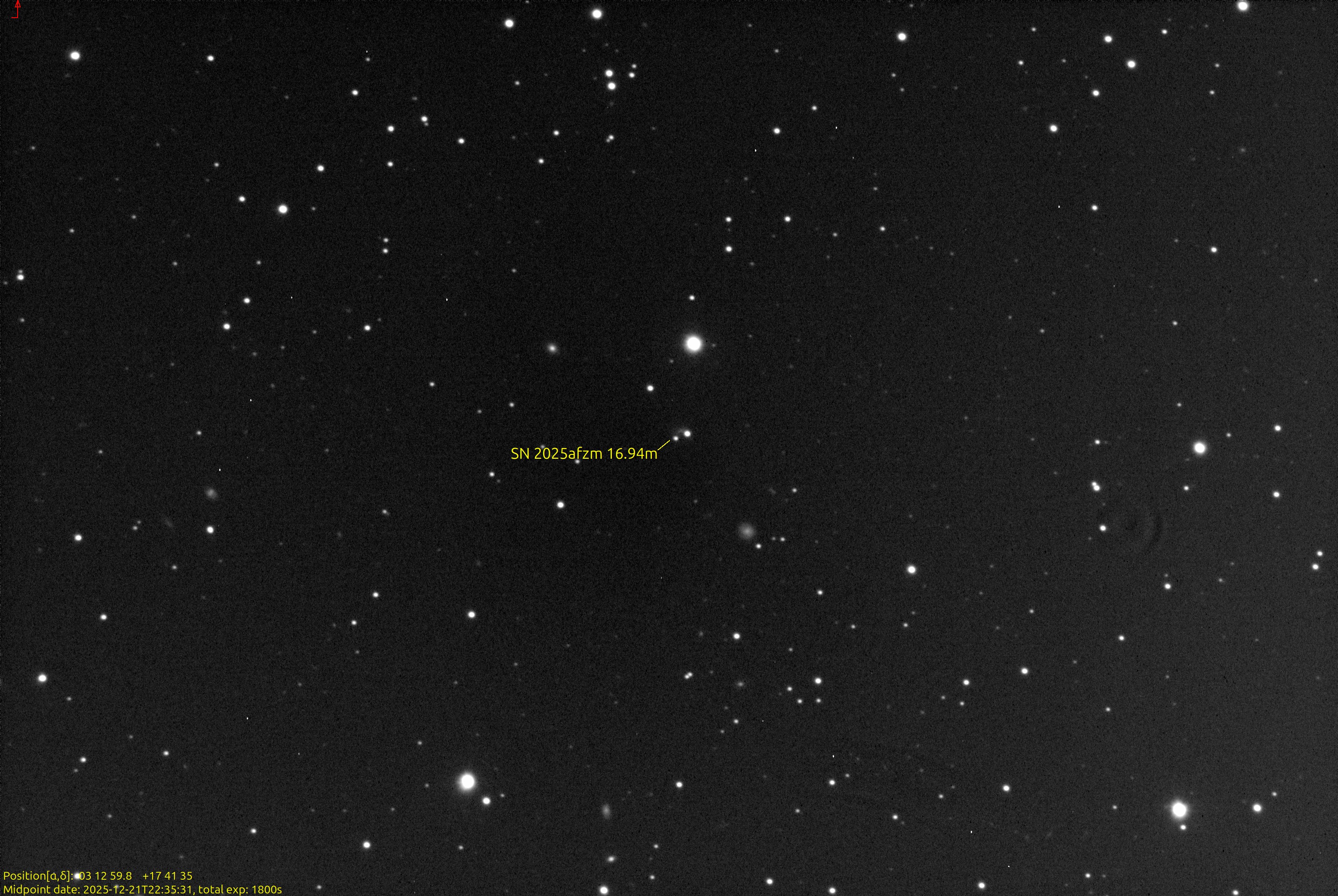 Found in UGC 11622 at R.A. = 20h44m37s.565, Decl. = -01°43'12".44 Located 2".7 east and 0".8 north of the center of UGC 11622 (Achim Sucker image) (Markus Kempf image) (Fabio Feijo image) (Richard Hill image) (Prosperi Enrico image facebook) (Manfred Mrotzek image) (Rafael Benavides image) (Stathis Kafalis image) Mag 18.5:12/11 (14.5:7/25), Type Ia (zhost=0.013770) (References: AstroNote 2025-208, ZTF observations) |
