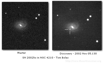 | 2002 has turned out to be an interesting year.  First 2002ap, a rare Hypernova in a Messier galaxy!  It didn't get as bright as expected (only Mag 12.3, and not 10.0 as originally predicted), but it put on a good show until going into solar conjunction.  Next we had a supprise with 2002ao which dropped from a nice bright mag 13 to mag 16 in 3 days.  A very dramatic drop for a supernova.  |