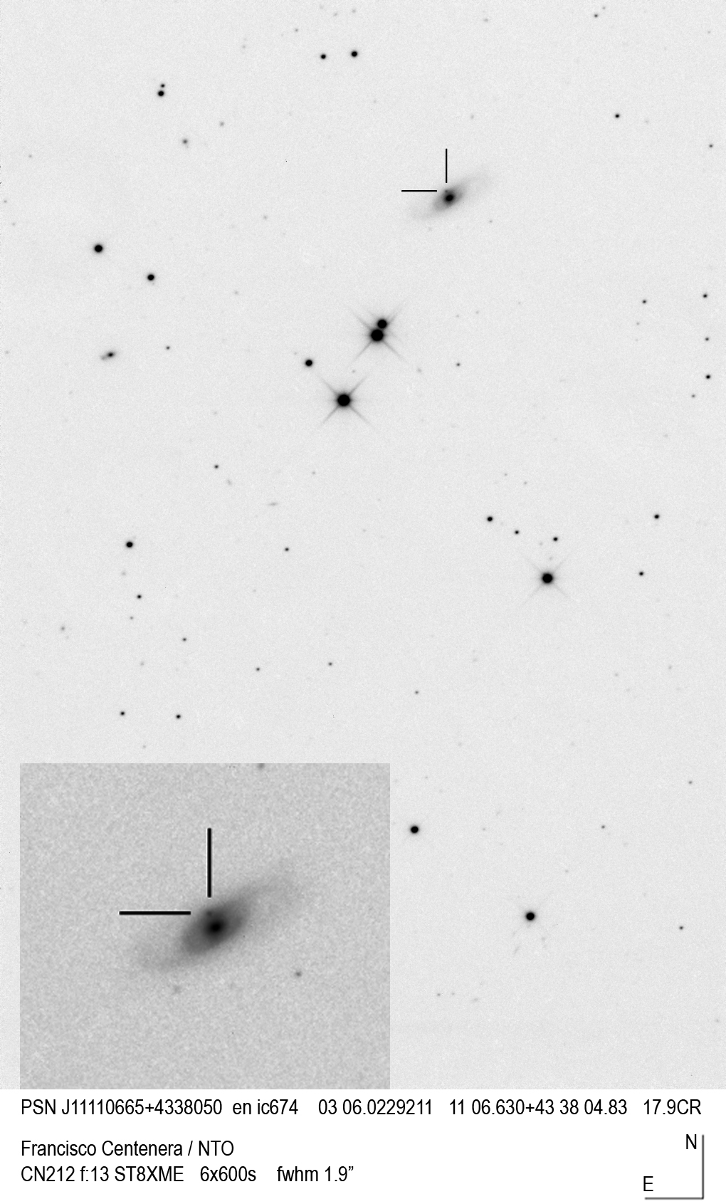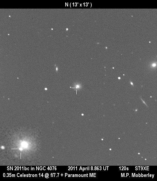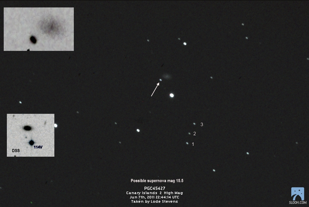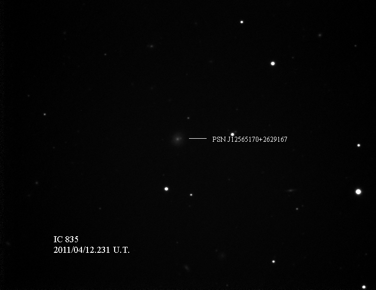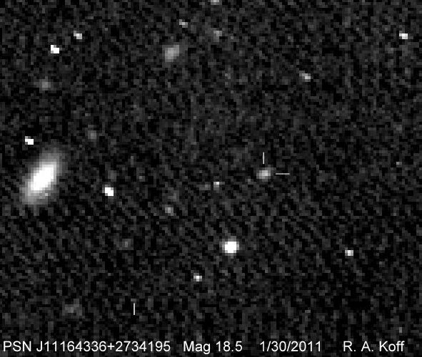 2011kc (= TCP J10355100+4109594) (= CSS111228:103551+410959), CBET 3017 discovered 2011/12/28.400 by Catalina Real-Time Transient Survey at R.A. = 10h35m51s.00, Decl. = +41°09'59".4 Mag 17.6:12/28, Type Ia (1N) (Discovery image) (Joseph Brimacombe image) (Robert Koff image) (References: CBAT TOCP, TNS)