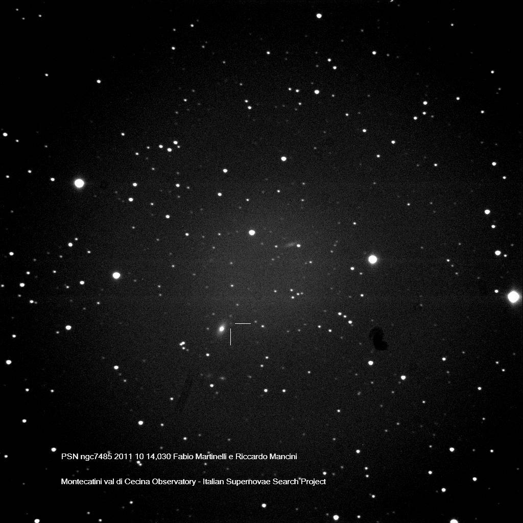 Found in an anonymous galaxy at R.A. = 23h40m11s.52, Decl. = +27°25'42".2 (near CGCG 476-101) Located 6".4 east and 2".2 south of the center of the host galaxy (Discovery image) (Joseph Brimacombe image) (JM Llapasset image) Mag 17.8** (17.0), Type Ia (z=0.031) (References: TNS; SN 2007rx) |