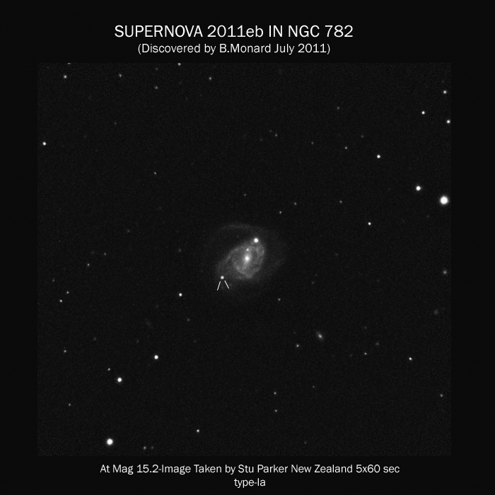 Found in NGC 2655 at at R.A. = 08h55m48s.50, Decl. = +78°13'02".7 Located 31".7 east and 21".4 south of the nucleus of NGC 2655 (Itagaki discovery image) (Tsuboi discovery image) Mag 21.3:12/28 (12.8:1/23), Type Ia (z=0.0047) (References: ATEL 3395, TNS) 2011B images sub-page |