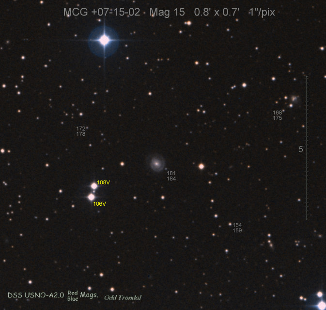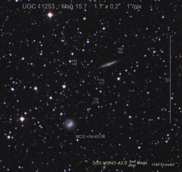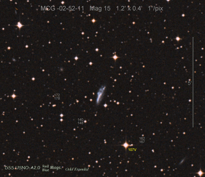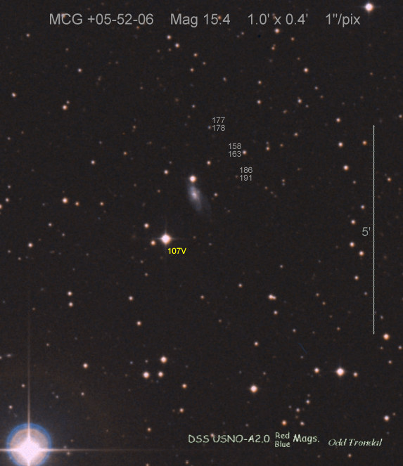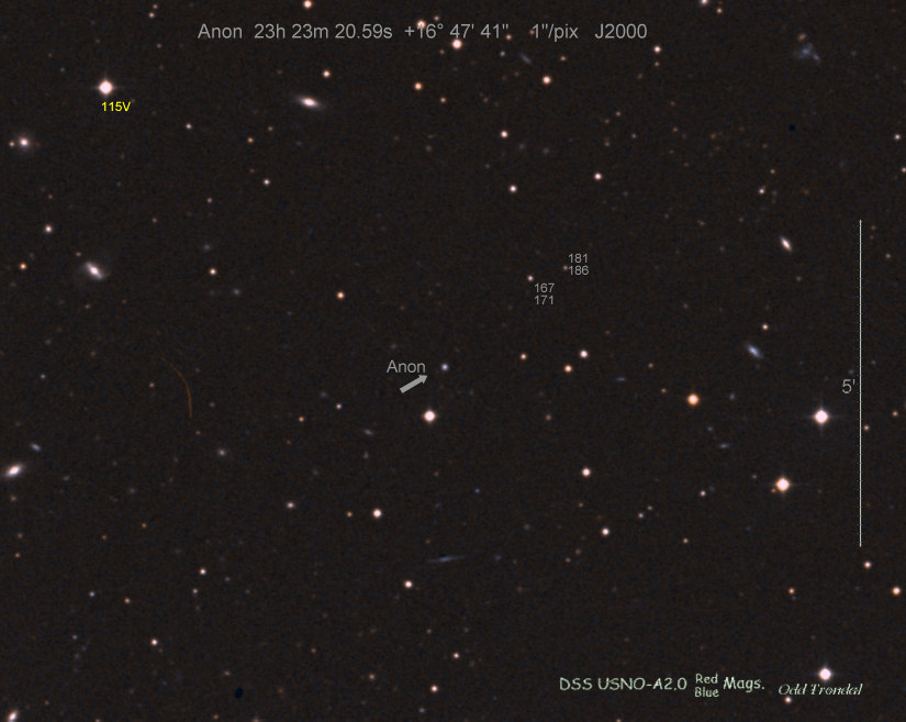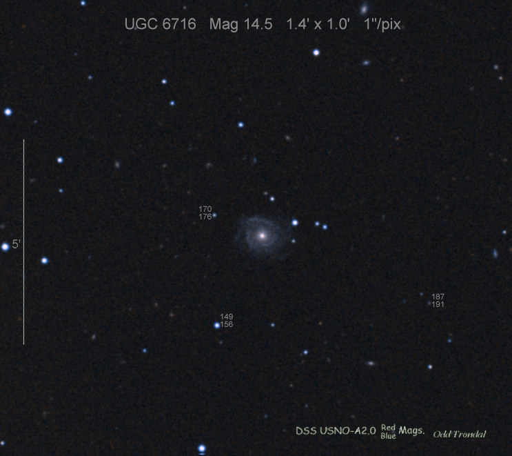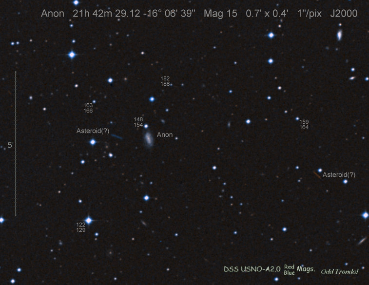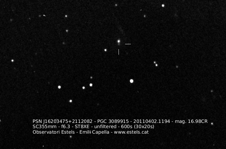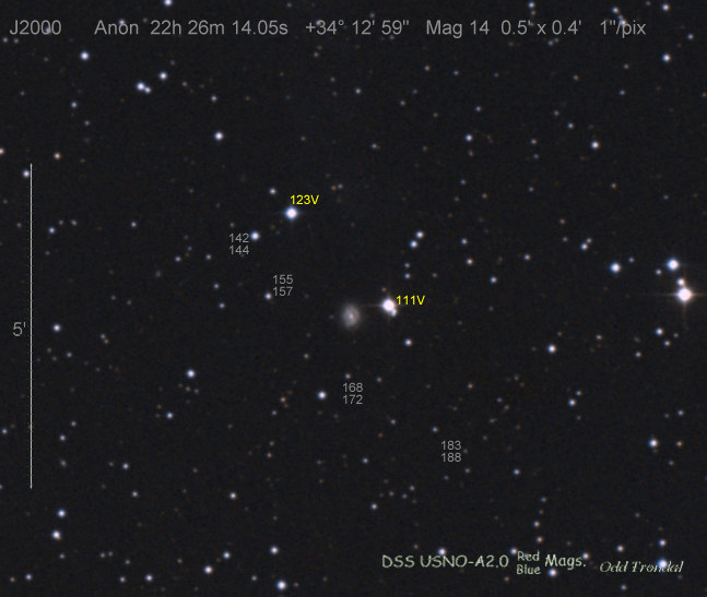 Found in MCG +5-52-6 at R.A. = 22h16m11s.24, Decl. = +27°54'24".8 Located 6" west and 4" north of the center of MCG +5-52-6 (Discovery image) (Joseph Brimacombe image) (William Wiethoff image) (Stan Howerton image) Mag 17.4:1/14 (17.2:12/31), Type unknown |