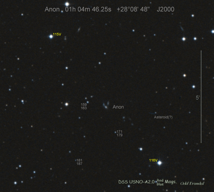 Found in IC 1748 at R.A. = 01h56m07s.19, Decl. = +17°38'46".8 Located 22" west and 16" north the center of IC 1748 (Discovery image) (Stan Howerton image) (Markku Nissinen & Veli-Pekka Hentunen image) (Joseph Brimacombe image) (Joseph Brimacombe image) (Andy Cason image) (Marc Serrau image) (Robert Koff image) Mag 18.5**, Type unknown |