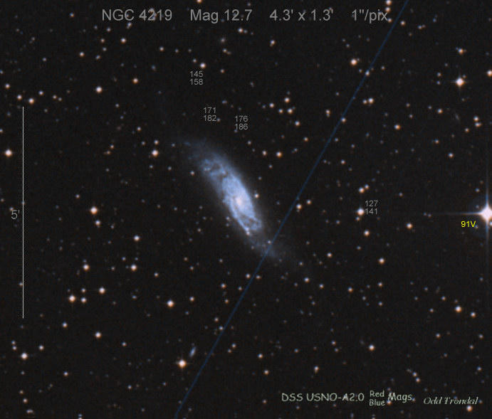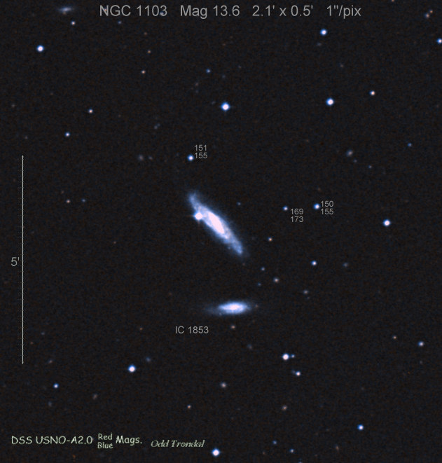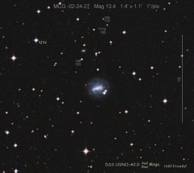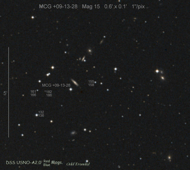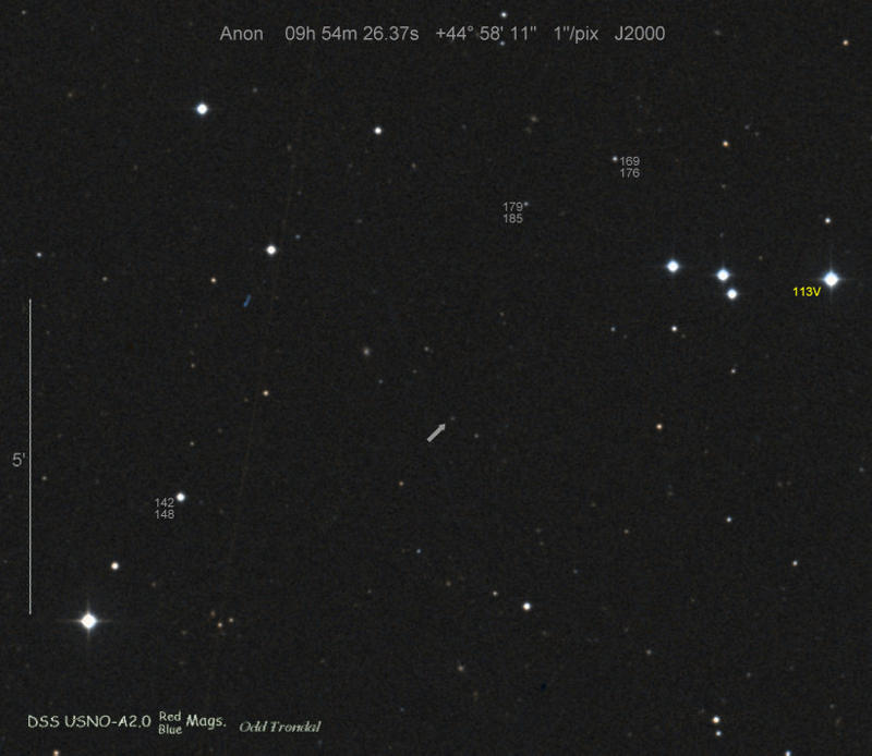 Found in an anonymous galaxy at R.A. = 11h02m30s.70, Decl. = +02°37'13".0 Located 0" east and 5" north of the center of host galaxy (Discovery image) (Stan Howerton image) Mag 19.0:5/8, Type unknown |