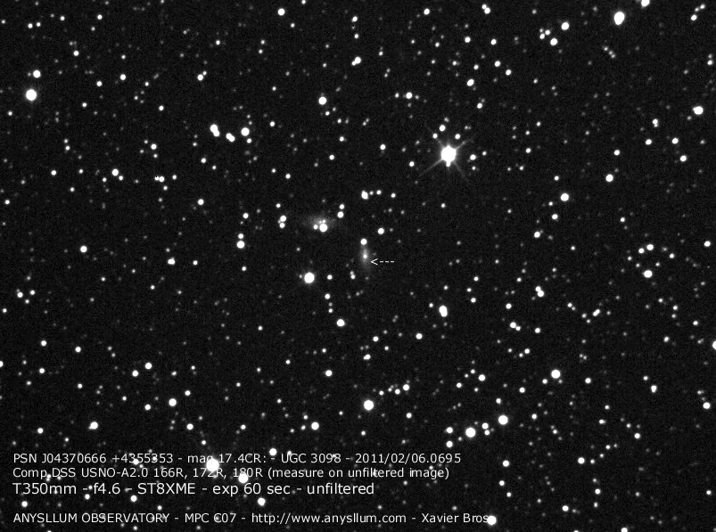 Found in UGC 2553 at R.A. = 03h08m31s.30, Decl. = +20°46'31".0 Located 9" east and 12" north of the center of UGC 2553 (Discovery image) (Stan Howerton image) Mag 20.0:10/6, Type unknown |