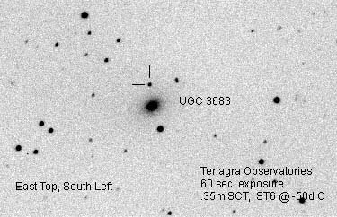 Found in UGC 3645 at R.A. = 07h04m00s.05, Decl. = +50°40'30".0 Located 10" west and 18" south of the center of UGC 3645 (Discovery image) (L. Kiss image) Mag 18.4:10/30, Type unknown (z=0.021) (References: TNS) |