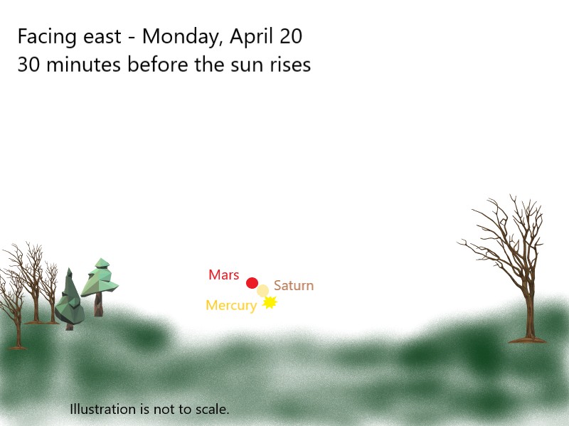 For those who rise before the Sun in the morning, there’s a close grouping of three planets on Monday, April 20th, low in the east. Thirty minutes before sunrise, find a flat observing location free from any obstacles such as buildings and trees. The planets Mercury, Saturn and Mars will appear in a tight line only 2° above the eastern horizon. Mercury, shining at a bright magnitude -0.2, can be seen naked-eye, but you’ll need binoculars to spot the other two which are dimmer. Saturn, at magnitude 0.9, can be found just north of Mercury and Mars, the faintest at only magnitude 1.2, will be north of Saturn.